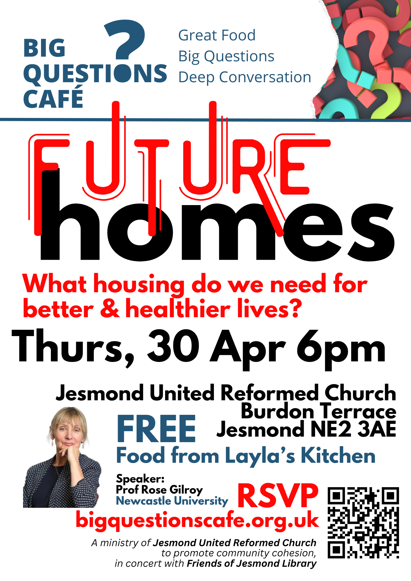 The Café is sponsored by Jesmond United Reformed Church, with the Friends of Jesmond Library. Over the past year, we’ve engaged in community listening exercises and a ‘Futures Literacy’ session. What we heard was the need for improved community cohesion. We always think it’s best to have discussions around a table filled with good food, so we thought these ‘Big Questions Cafés’ might be a way to bring us all together. These cafés are offered up with no other expectation than for people to show up, share in a great meal together, and engage in discussion over big questions that help us identify what we can do together. There’s no charge as we see this as a ministry, but donations are gratefully accepted—just click the donations link when registering are contribute when you arrive.